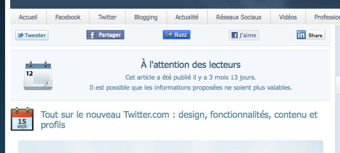 Enfin, prenons quelques instants pour nous intéresser aux détails, et en particulier à une petite fonctionnalité que j’apprécie particulièrement. Puisque mes articles proposent souvent des conseils pouvant devenir caduques suite à des mises à jours de certains réseaux sociaux (qui évoluent très vites !), un encart spécifique apparaît sur tout billet vieux de plus de deux mois afin de mettre le lecteur en garde (« Cet article a été publié il y a 4 mois et 29 jours, il est possible que les informations proposées ne soient plus valables »). De quoi éviter les mauvaises surprises et les lecteurs déçus.