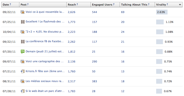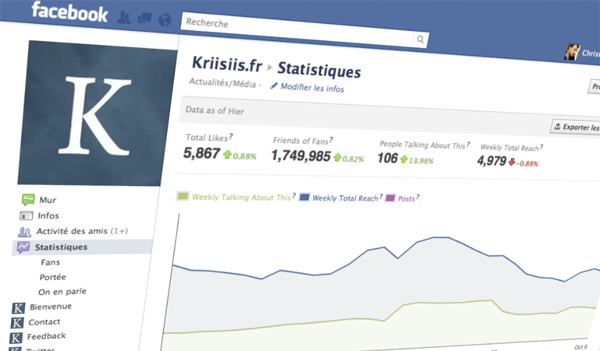 Reste désormais à savoir pourquoi les données avant le 19 Juillet 2011 ne sont pas exportables, et pourquoi il n’est pas possible d’obtenir des résultats sur une période supérieure à 35 jours (!). Un membre de l’équipe Facebook saurait-il nous renseigner à ce sujet ? Si vous avez la moindre question ou la moindre suggestion au sujet de cet article, n’hésitez pas à m’en faire part à travers les commentaires, sur la Fan-Page Kriisiis.fr sur Facebook, ou encore sur Twitter, pseudo @Kriisiis.