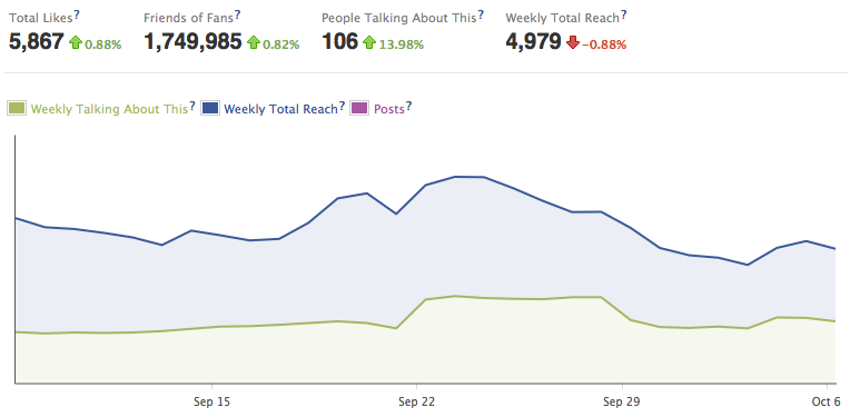Si vous êtes un visiteur régulier des –désormais anciens– Insights de votre Fan-Page, alors vous n’êtes pas sans savoir que Facebook met particulièrement en avant un ensemble de trois indicateurs : les « Daily New Likes », le « Total Likes » et les « Monthly Active Users ». Dans les nouvelles statistiques, Facebook conserve les deux derniers indicateurs (remplaçant « Monthly Active Users » par « Weekly Total Reach ») et en rajoute deux autres : « Friends of Fans » et « People Talking About This ».