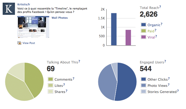 Facebook profite de l’occasion pour rajouter deux colonnes à ce tableau : « Engaged Users » (personnes ayant réalisé une action sur votre publication, tel qu’un clic) et « Talking About This » (personnes ayant aimé, commenté ou partagé votre publication). A noter également que chaque chiffre peut être cliqué, avec à la clé, des détails sur leur constitution (répartition entre l’organique, le payé ou le viral pour le « Reach », entre les commentaires, les Likes et les partages pour le « Talking About This », etc.).