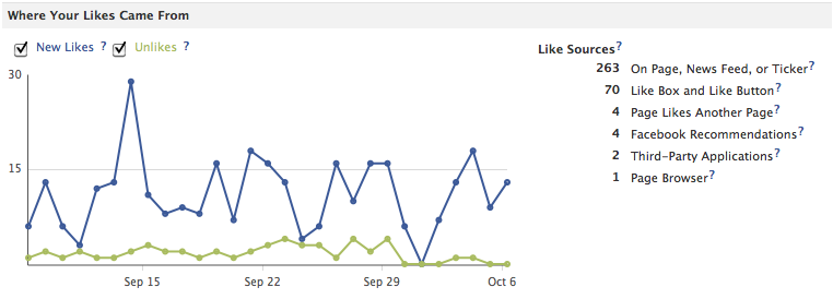 Sur ma page, les sources de trafic sont « le flux d’actualité ou le ticker », « le bouton Like ou la Like Box », le « Like de page par une autre page », la « recommandation de page », les « applications tierces » et le « Page Browser », mais la documentation de Facebook indique qu’elles peuvent être de 12 types différents, tels que « l’invitation par un administrateur », les « Facebook Ads et Sponsored Stories », le « mobile » ou encore « l’ajout lors du processus de création d’un compte Facebook ».