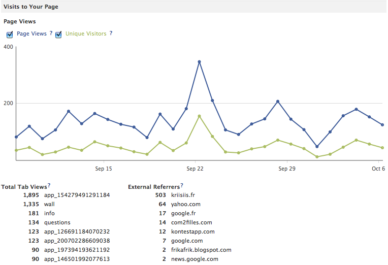 Un autre graphique nous indique l’évolution des visites sur notre page, avec une distinction entre les visites et les visiteurs uniques, donnée très intéressante car permettant (enfin) d’évaluer le pourcentage de fans qui se rendent directement sur la page et qui ne se contentent pas de visualiser les publications dans leur flux d’actualité. Enfin, viennent s’associer une distinction par onglet (natifs… ou non !) ainsi que les sources de ces visites (lorsque la provenance se fait depuis une URL qui n’est pas propre à Facebook, un blog par exemple).