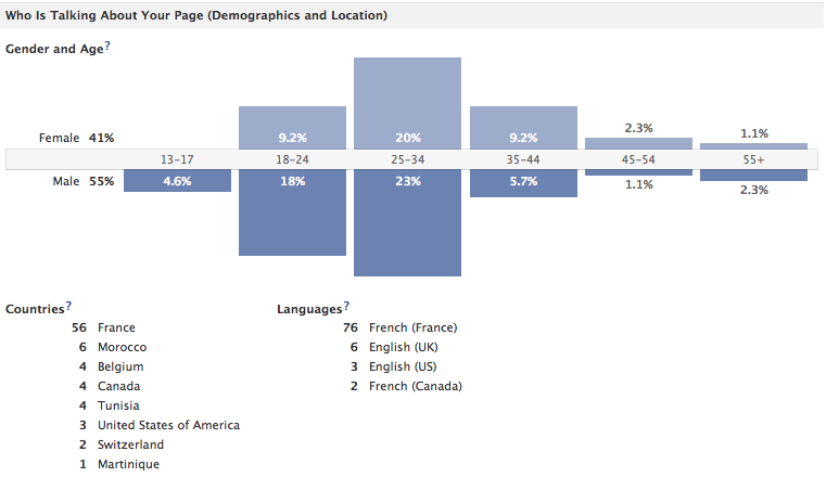 Encore une fois, la première partie de cet onglet ressemble sensiblement à celle des onglets « Fan » et « Portée », à la seule différence que les villes ne sont pas renseignées : nous ne retrouvons ainsi que le genre, la tranche d’âge, le pays et la langue (ou plutôt la langue de son compte Facebook : j’utilise par exemple Facebook en anglais alors que je suis francophone). Si quelqu’un sait pourquoi cet indicateur n’est pas présent dans ce cas de figure, qu’il n’hésite pas à m’en faire parvenir la raison.