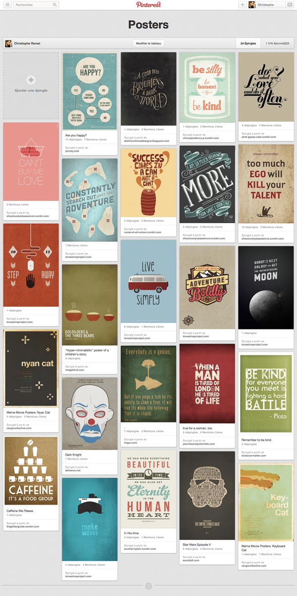 J’ai commencé à m’intéresser à Pinterest fin 2011, lorsque certaines études soulignaient (déjà, à l’époque) l’importance du trafic généré par la plateforme. Si je l’utilise parfois pour le compte de mes clients, je reste cependant un cordonnier bien mal chaussé, avec peu de tableaux, aussi mal rangés que ma chambre il fut un temps. Mon board « Posters » est l’exception qui confirme la règle, puisque j’y rassemble des illustrations motivantes ou inspirantes, voire des créations graphiques qui m’ont marqué.
