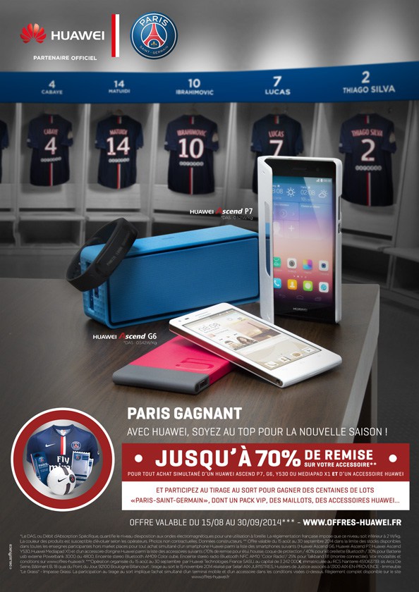 Dans le cadre de ce partenariat, Huawei a lancé le jeu Le Paris Gagnant pour récompenser ses clients et leur permettre de bénéficier d’une remise allant jusqu’à 70% sur l’achat d’un produit de la marque. Cette offre de remboursement permet de participer à un tirage au sort avec de nombreux lots mis en jeu, notamment un voyage pour 4 personnes pour assister à un match du PSG à Paris ou une vingtaine de téléphones Huawei.