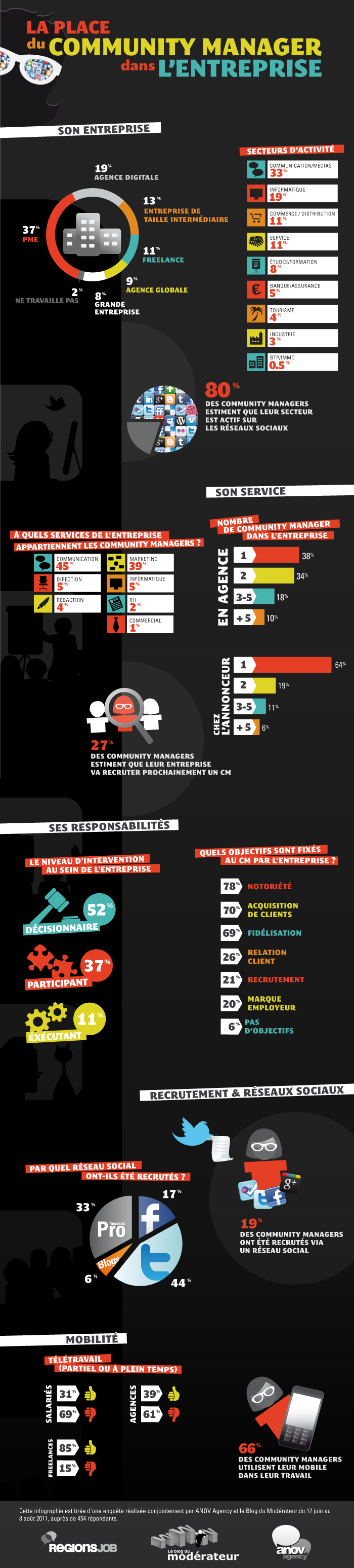 Bonjour à toutes et à tous. Le 21 Juin dernier, je vous avais proposé de participer à la grande enquête sur le Community Management en France, menée conjointement par RegionsJob et ANOV Agency du 17 Juin au 8 Août 2011. J’ai désormais le plaisir de vous annoncer que près de 5 mois après la publication de ce billet, 454 participations de la part de Community Managers et 2 semaines après la publication des résultats, les 4 infographies reprenant les chiffres marquants de cette enquête sont désormais prêtes.