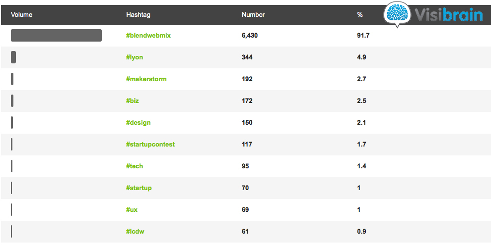 Du côté des hashtags, #BlendWebMix truste la première place avec 91.7% de part-de-voix, avant que le lieu (#Lyon, 344 mentions, 4.9%), des activités (#MakerStorm, 192 mentions, 2.7% – #StartupContest, 117 mentions, 1.7%) et des thématiques (#Biz, 172 mentions, 2.5% – #Design, 150 mentions, 2.1% – #Tech, 95 mentions, 1.4%) ne complètent les places suivantes.