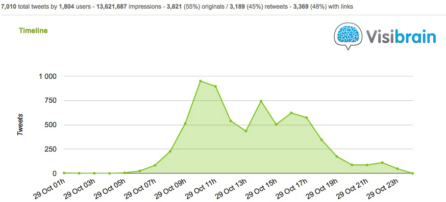 Avant toute chose, parlons « nombre de tweets ». Ce jour, 7.010 tweets concernant le Blend Web Mix qui ont été publiés (3.821 tweets engendrant 3.189 retweets), dont 6.430 contenant le hashtag #BlendWebMix. Le record est de 950 tweets en une heure, le matin entre 10 et 11 heures, tranche couplant à la fois la plénière d’ouverture et certaines conférences très attendues.