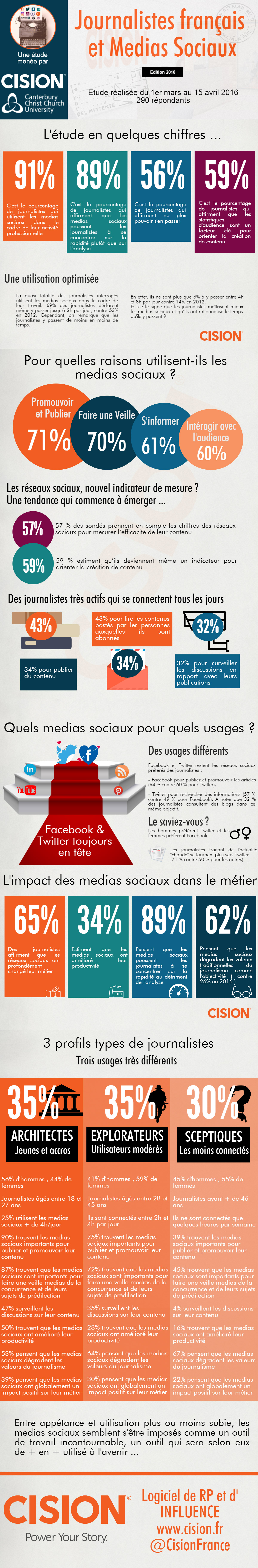 Le journalisme a subi de profondes transformations en moins de 10 ans, notamment avec l’arrivée des réseaux sociaux. Ces mutations ont sonné la fin de l’information descendante – les journalistes diffusent une actualité et les gens la lisent – et ont permis sa démocratisation. Tout le monde peut désormais s’exprimer et être entendu. Ces mutations ont également eu des conséquences sur ceux qui travaillent directement en contact avec eux : les communicants et les attachés de presse. En tant que fournisseur de logiciels de relation presse et d’influence, Cision a voulu en savoir plus en réalisant une étude sur le sujet. Ils ont donc interrogé 290 journalistes français sur leur pratique des réseaux sociaux.