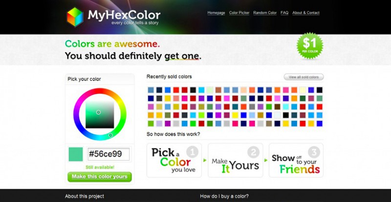 « Oh le ringard. Oh le grand ringard. Il a pas encore acheté sa couleur ». C’est un peu le genre de message que l’on peut croiser sur le net ces derniers jours, en particulier depuis qu’un site internet hollandais, MyHexColor.com, propose tout simplement (et très sobrement) aux internautes d’acheter… leur couleur hexadécimale. Alors bien sûr, l’achat est fictif (mais le coût bien réel, 1$), et on pourra se dire « Tss, on fait vraiment du fric avec tout aujourd’hui », mais je dois avouer que je suis conquis, puisque l’idée est tout simplement géniale. Imaginez une horde d’internautes du monde entier se bagarrer pour un #56N951 ou un #F73636… Ça paraissait compliqué il y a quelques années, c’est désormais possible aujourd’hui. Par contre, ne comptez pas sur moi pour acheter une couleur qui ne me servira jamais ! Véritable succès commercial, MyHexColor.com ne cessera pas de vous étonner.