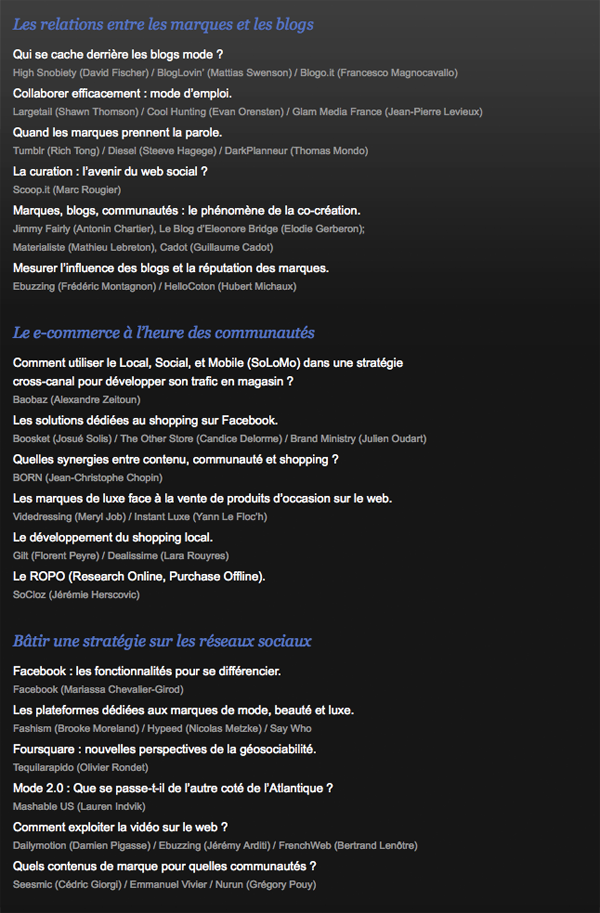 La liste des 38 intervenants est impressionnante, représentant des sociétés « plutôt web » (Facebook, Boosket, Seesmic, FrenchWeb, Mashable, Tumblr, Scoop.It, Nurun, Dailymotion), « plutôt mode & luxe » (Diesel, et d’autres que je connais un peu moins), ou les deux (Born, Giltcity, HelloCoton, Ykone, VideDressing, DarkPlanneur, Jimmy Fairly). L’occasion également de croiser ces chers Cedric Giorgi (Seesmic) et Gregory Pouy (Nurun), que vous connaissez sans doute puisqu’on les retrouve partout, tout le temps !