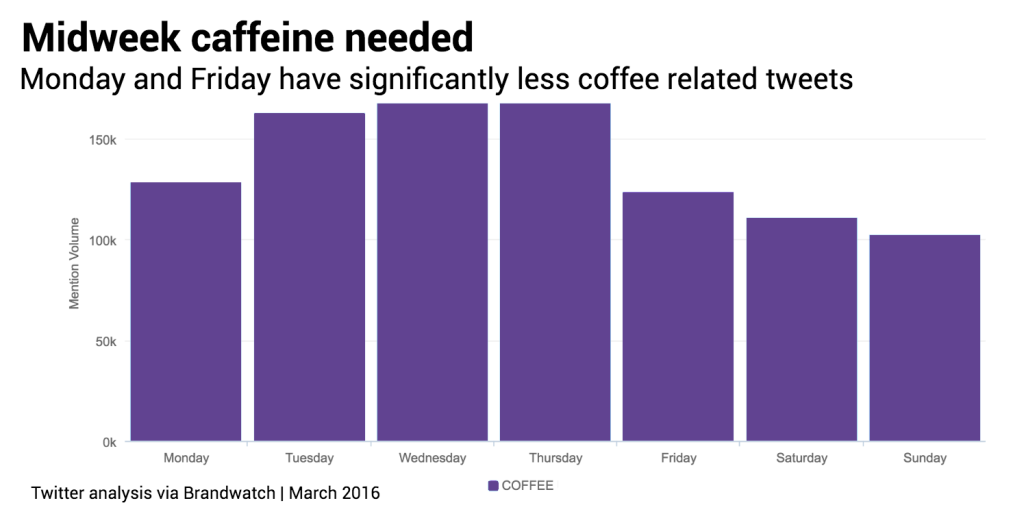 11h : il est au travail depuis seulement quelques heures, mais l’envie de café se fait à nouveau sentir. Surtout si l’on est mercredi ou jeudi, les deux jours de la semaine où les twittos américains en parlent le plus sur les réseaux sociaux. Objectif : se donner un coup de boost et tenir jusqu’au week-end.