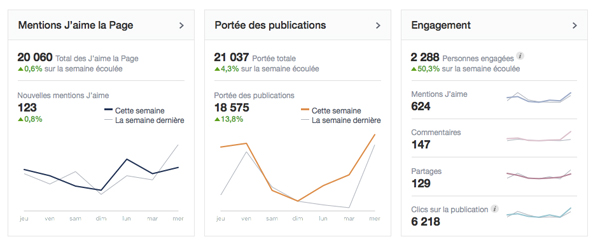 Premier constat, le graphique couplant publications, personnes qui en parlent et portée hebdomadaire laisse désormais place à un ensemble plus complet de données clés. Si l’on retrouve toujours ces 3 chiffres (les « Personnes qui en parlent » s’appelant désormais « Personnes engagées »), les nouveaux fans, la portée des publications, le nombre de J’aime, de commentaires, de partages et de clics sont désormais affichés, confrontés parallèlement à la performance de la semaine précédente.