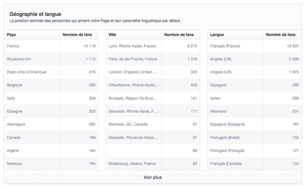 Le troisième et dernier onglet « Personnes » est une nouvelle fois découpé en 3 onglets. Fort logiquement, il regroupe les « Fans », les « Personnes atteintes » et les « Personnes engagées », permettant de confronter ces données pour tenter de déceler un éventuel décalage entre le membre type et le partageur type, et donc la nécessité d’optimiser sa ligne éditoriale. On retrouve ainsi l’âge et le genre des membres de la communauté, ainsi que le découpage par « Pays », par « Ville » ou par « Langue ».