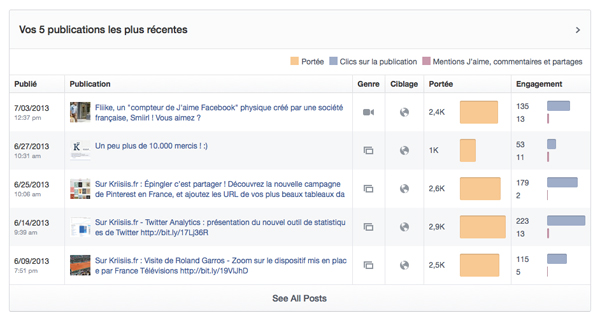 Sous ces différentes données, Facebook présente les 5 publications les plus récentes, un peu de la même manière que sur la précédente interface, si ce n’est que le système d’entonnoir n’est plus valorisé (la « Portée » était suivie des « Utilisateurs engagés » puis des « Personnes qui en parlent »). Ici, si la « Portée » est toujours visualisable, elle n’est plus affichée sous forme de chiffre précis, tout comme les « Utilisateurs engagés ». Le signal de Facebook est plutôt clair : tout se passe dans les autres onglets.