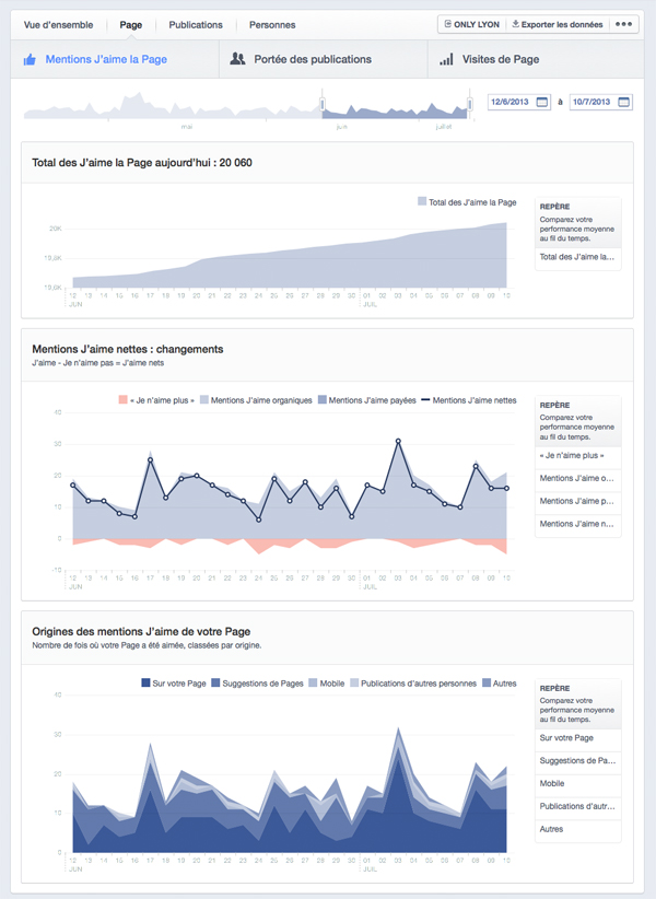 L’onglet « Page » est divisé en 3 sous-onglets. Le premier, « Mentions J’aime la Page », affiche la progression du nombre de fans, les « Mentions J’aime nettes » (la différence entre le nombre d’abonnements et le nombre de désabonnements, dont le nom est précisé pour la première fois par Facebook si je ne m’abuse), et « l’Origine des mentions J’aime de la Page », le tout dans de jolis graphiques au sein desquels différents critères peuvent être étudiés spécifiquement.
