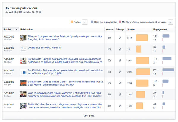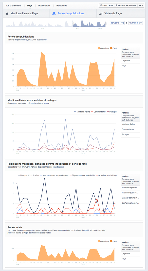Le second sous-onglet, « Portée des publications », me paraît ne pas se situer dans le bon onglet (pourquoi « Page » et non « Publications » ?). Toujours sous forme de graphiques, il présente la portée organique ou payée des publications, le nombre de J’aime, commentaires et partages, mais également les publications masquées ou signalées comme indésirables… et la portée totale. Et la Ô combien intéressante portée virale dans tout ça ? Adios la portée virale, Facebook impose désormais de la calculer soi-même…