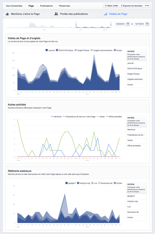 Enfin, le troisième sous-onglet « Visites de Page » reprend globalement l’ancien onglet « Portée », avec les visites du Journal et des différents onglets, les « Référents extérieurs » mais également « d’autres activités » (visites, offres achetées, mentions, publications de tiers sur la page). On notera également l’arrivée de la sélection de plage de temps à la souris, un peu plus agréable que la sélection par calendrier, sur tous les sous-onglets de la partie « Page ». Et ça, c’est un vrai point positif.