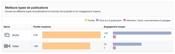 Enfin, l’onglet « Meilleurs types de publications » affiche simplement les médias au plus fort impact (en terme de portée et d’engagement) sur la page ; une manière de valider le fait que, hors exceptions, la photo reste de loin le genre qui fait le plus réagir. Pour résumer, l’onglet « Publications » est donc moins fourni que l’onglet « Page », rassemble certaines données déjà existantes voire nouvelles, mais fait surtout disparaître plusieurs indicateurs probablement jugés trop bruyants par Facebook.