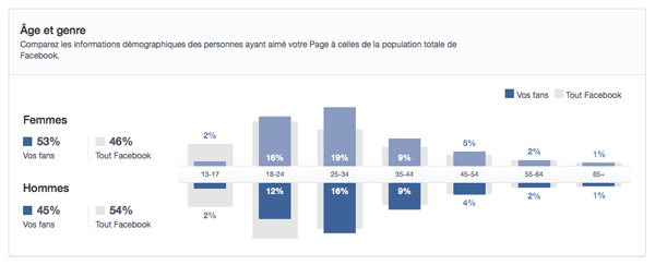 Une nouveauté est toutefois à noter : la confrontation entre sa propre répartition et celle globale de Facebook, que ce soit pour les tranches d’âge par exemple, ou encore pour le pourcentage de personnes concernées, Hommes ou Femmes. Malgré un bug visuel sur les 2 derniers onglets (la troisième colonne filant sous les deux premières, du moins sur mon Mac), ces données ne devraient pas trop perturber les utilisateurs réguliers des statistiques Facebook puisque ces dernières n’ont que très peu évolué.