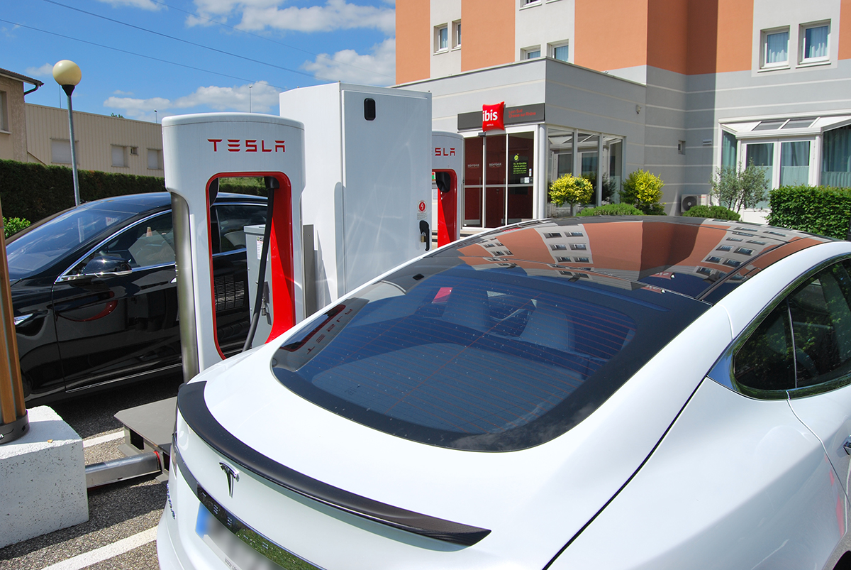 Pour tester un superchargeur, nous avons roulé quelques kilomètres au sud de Lyon pour atteindre la station de Chasse-sur-Rhône, située à proximité de l’autoroute. Nous avons fait des paris pendant le trajet concernant la présence ou non d’une éventuelle autre Tesla en charge sur le parking de l’Hôtel Ibis… mais n’avions pas anticipé la présence de 3 autres véhicules ! Au total, quatre modèles S dont trois P85 et une P85D, un Norvégien, un Suisse, et deux Français. Au delà de discussions passionnées avec d’heureux propriétaires, nous avons toutefois identifié une ombre au tableau : lorsque deux véhicules utilisent chacun leur superchargeur dans une station, le nombre de kilowatts est divisé par deux et la durée de recharge multiplié dans les mêmes proportions (ce qui reste toutefois extrêmement court : nous ne sommes restés que quelques dizaines de minute, à bronzer au soleil).