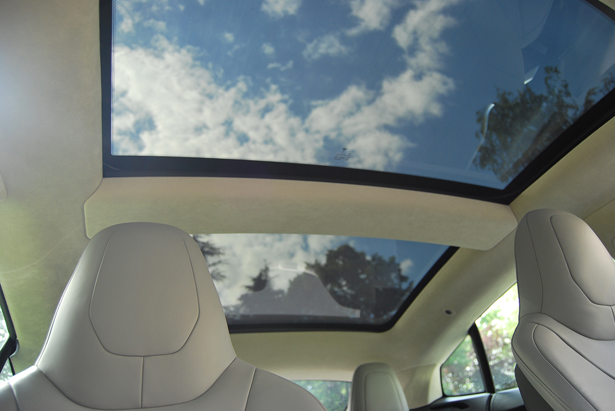 Bien courageux sont ceux prêts à passer du temps dans une Tesla, car il est ensuite très difficile de redescendre sur terre (je caresse désormais le tableau de bord de mon Audi comme on pourrait tapoter l’épaule d’un proche en lui disant « Tu sais, l’important… c’est de participer… »). Tout y est magnifique : le tableau de bord est en vrai bois à la couleur parfaite (obeche), les pièces en aluminium viennent apporter une touche sportive délicieuse, le volant est superbe et les sièges en cuir ont l’air si précieux que l’on hésite à y poser un jean entrée de gamme. Dans le cas présent, une (belle) option nous a permis de profiter d’un immense toit ouvrant, dont mon seul regret est que seule la partie avant puisse être ouverte. Mais à vaincre sans péril, on triomphe sans gloire ! Tesla se réserve sans doute un lot d’amélioration pour les prochains modèles ; il ne s’agirait pas d’écœurer la concurrence si rapidement…