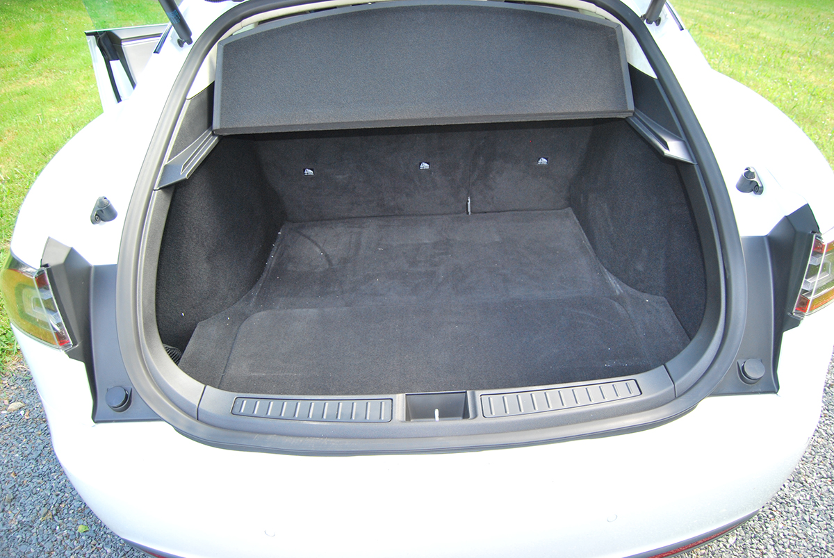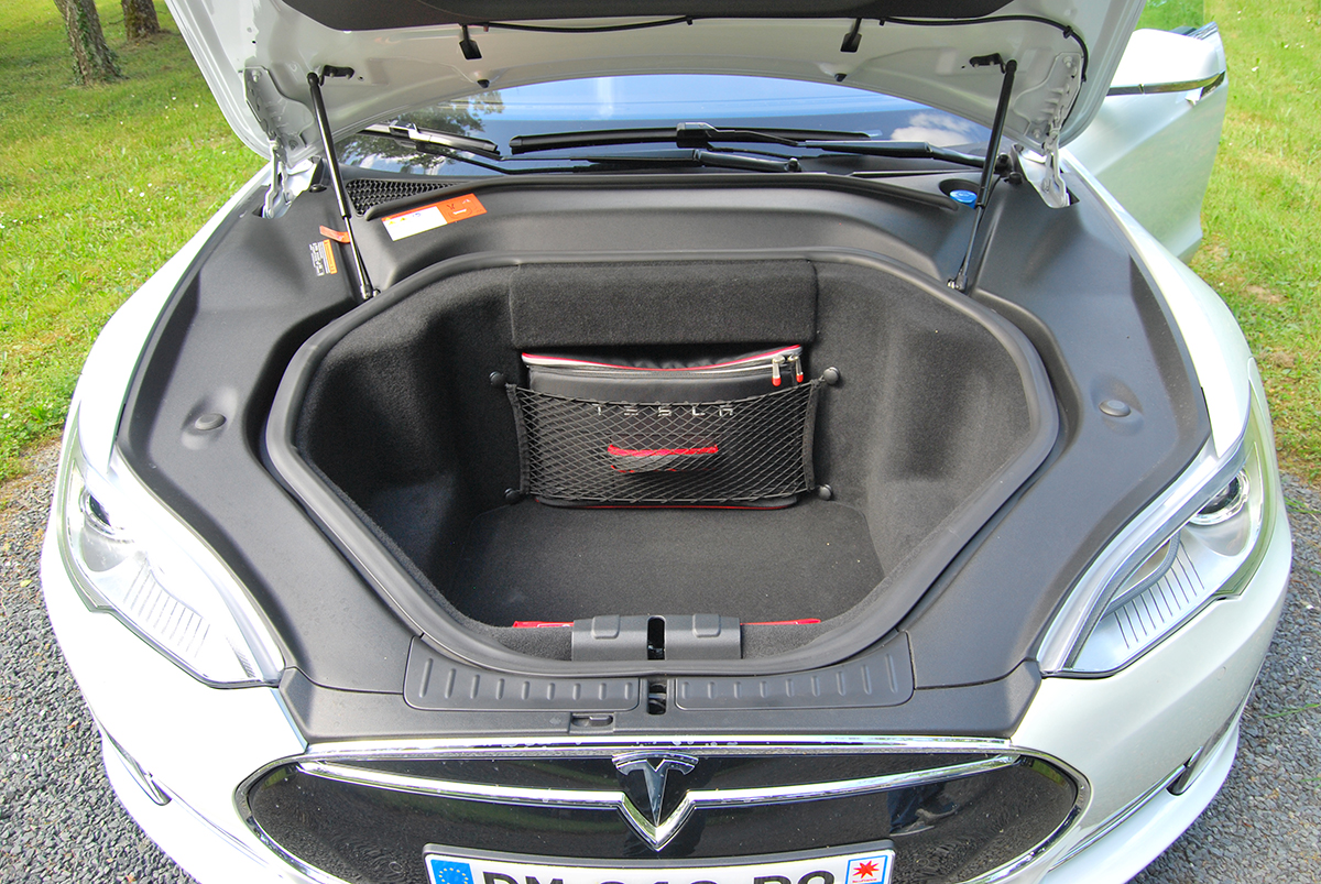 Comme vous vous en doutez, l’une des particularités des Tesla est qu’elles n’ont pas de moteur thermique. Et qui dit « pas de moteur thermique » dit « beaucoup de place pour les rangements », car son / ses petit(s) moteur(s) occupe(nt) un très faible espace, bien inférieur au volume des moteurs traditionnels, sous les sièges arrières voire entre les roues et le tableau de bord (selon modèles). Le véhicule possède ainsi un joli coffre à l’arrière mais également un très bel espace à l’avant, pour une capacité totale de l’ordre de 900 litres, ce qui est énorme pour une berline de ce type. Les photos ci-dessous vous permettent de vous faire une idée, en sachant que la valise derrière le filet à l’avant occupe déjà pas mal d’espace et qu’une petite trappe à l’arrière permet d’accéder à un espace supplémentaire.