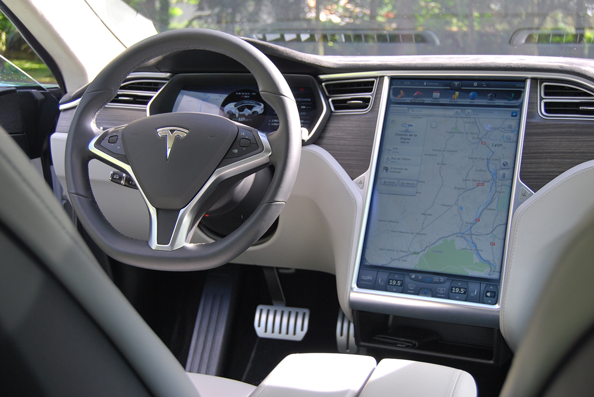 Concernant l’écran tactile, car je sais bien que c’est l’un des éléments qui fait le plus parler dans mon entourage, l’expérience est conforme à mes attentes : le tactile se rapproche des ordinateurs de bord classiques, mais ses dimensions pharamineuses (17 pouces) font penser que l’on a collé deux ipad l’un au dessus de l’autre, ce qui est le summum en terme de confort. La navigation est simple et efficace, les catégories telles que « Multimédia », « Navigation », « Agenda », « Téléphone » ou encore « Énergie » sont complètes et intuitives et peuvent être combinées simultanément (par exemple : une playlist audio sur la partie supérieure de l’écran, la carte avec trajet pour se rendre au superchargeur le plus proche sur la partie inférieure). Le cadran derrière le volant est également un bel écran ; j’ai d’ailleurs été bluffé par son ergonomie, son design et par l’affichage de la route à suivre (GPS), d’une clarté et praticité rares.