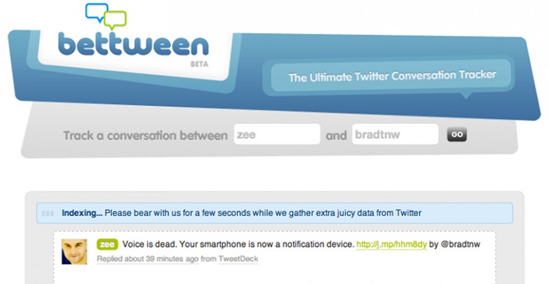 Twitter n’a jamais été un outil favorisant le dialogue entre deux internautes, et pourtant, il ne se passe pas un jour sans que vous puissiez voir de longues discussions entre deux utilisateurs sur la plateforme de microblogging. Cependant, il n’est pas rare que vous n’ayez ni le temps ni l’envie de suivre l’intégralité d’une conversation pourtant intéressante dans l’immédiat, et pourtant remettre ça à plus tard s’avère périlleux, surtout lorsque vous avez beaucoup de following et donc un grand nombre de tweets dans votre timeline. Heureusement pour vous, je vous propose aujourd’hui de découvrir Bettween, qui s’auto-proclame « le tracker ultime de conversations Twitter », et sachez-le, ils disent vrai. Pourquoi ? D’abord parce que Bettween vous permet de manière très rapide et ergonomique de générer l’ensemble des messages échangés entre deux twittonautes depuis la création de leur compte, avec un système de couleurs, l’affichage des avatars, et tout le tralala. Ensuite, parce que cet outil vous permet également de partager une discussion sur le réseau social, et ce en seulement deux clics, ce qui vous offre la possibilité d’en faire profiter vos amis ! Finis donc les après-midi investis à remonter votre timeline à la recherche du chainon manquant d’une discussion, vous avez désormais toutes les cartes en main pour ne plus rien louper des conversations de vos amis twittonautes.