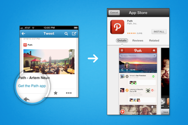 La carte « App » permet de valoriser le nom, la description, l’icône, la notation et le prix d’une application mobile. Pouvant être visualisée uniquement sur l’application Twitter iOS et Android pour le moment (et non via navigateur web ou mobile), elle permet donc de valoriser son application mobile. Twitter recommande de limiter la carte « App » à votre page d’accueil ou à une éventuelle page « À Propos », puisque son affichage pour l’ensemble des pages viendrait handicaper la visibilité d’un contenu spécifique.