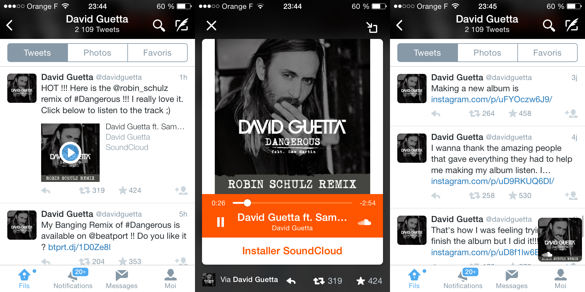 En cliquant sur le lien Soundcloud sur iOS ou Android, les utilisateurs de Twitter découvrent ainsi une présentation de la séquence audio en plein écran (permettant de la mettre en pause, ou… d’installer l’application Soundcloud), et surtout, peuvent retourner sur leur flux Twitter sans la stopper en cliquant sur une icône située en haut à droite : de retour sur la timeline, une vignette apparaît alors sur la droite de l’écran afin de permettre une nouvelle interaction avec la musique, l’interview, le podcast ou autre type de contenu audio, sans pour autant masquer les tweets. À noter que cette vignette disparait lors de la rédaction d’un nouveau tweet, pouvant difficilement prendre place à côté ou au dessus du clavier.
